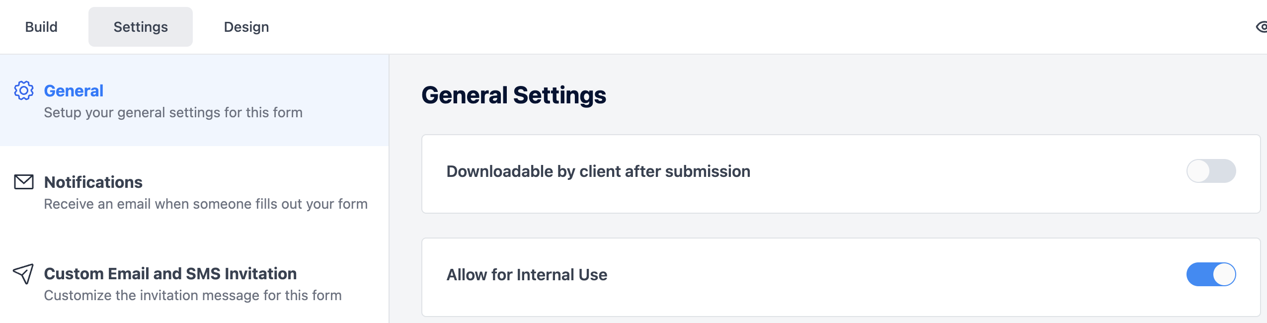 - Locate the Form that you want use as an "Internal Form" Toggle "Allow for Internal Use" on under the forms settings.