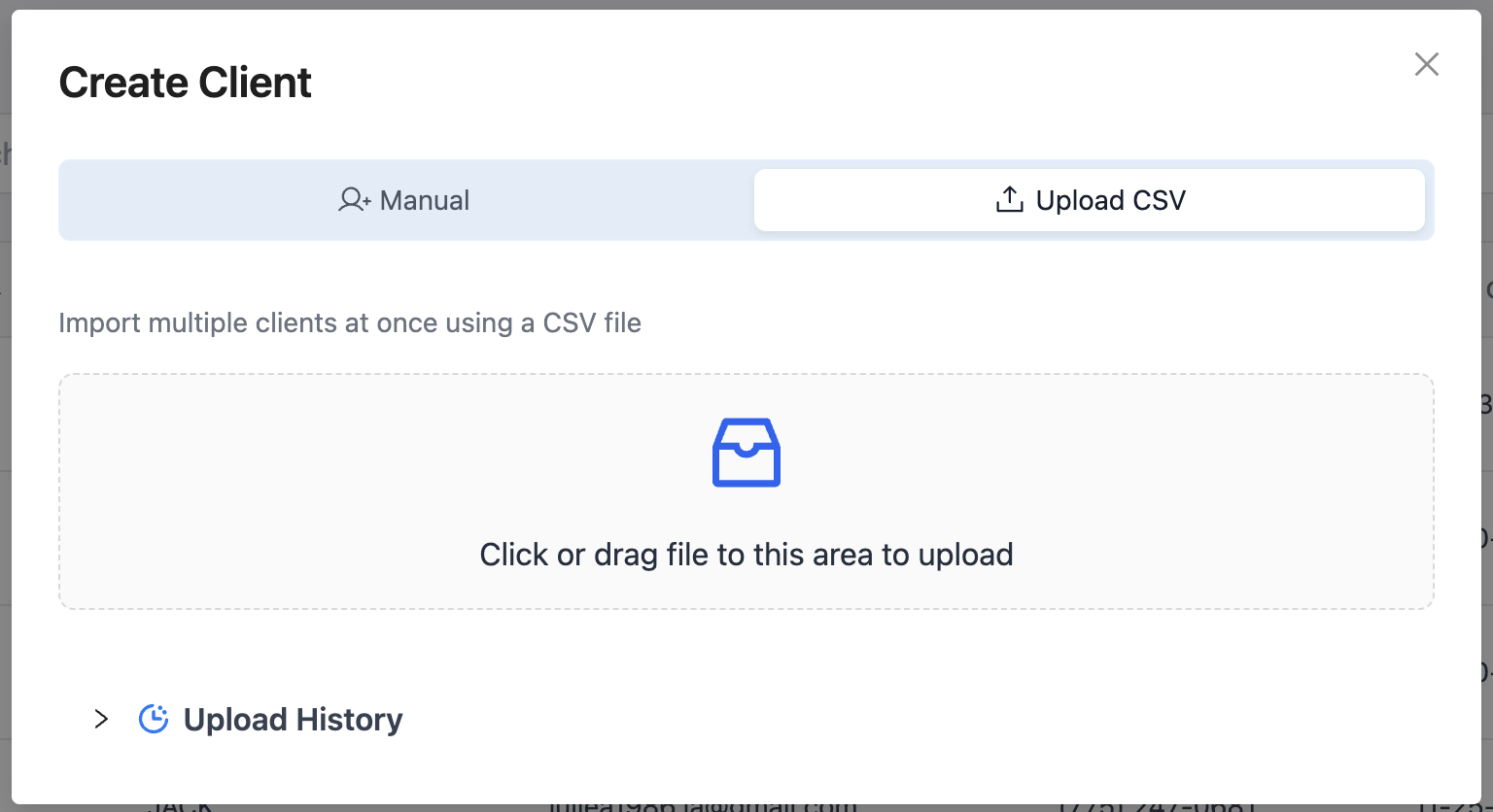 In the top right corner, click the Create Client button. This will open the client creation menu where you can either add a single patient manually or upload a list.