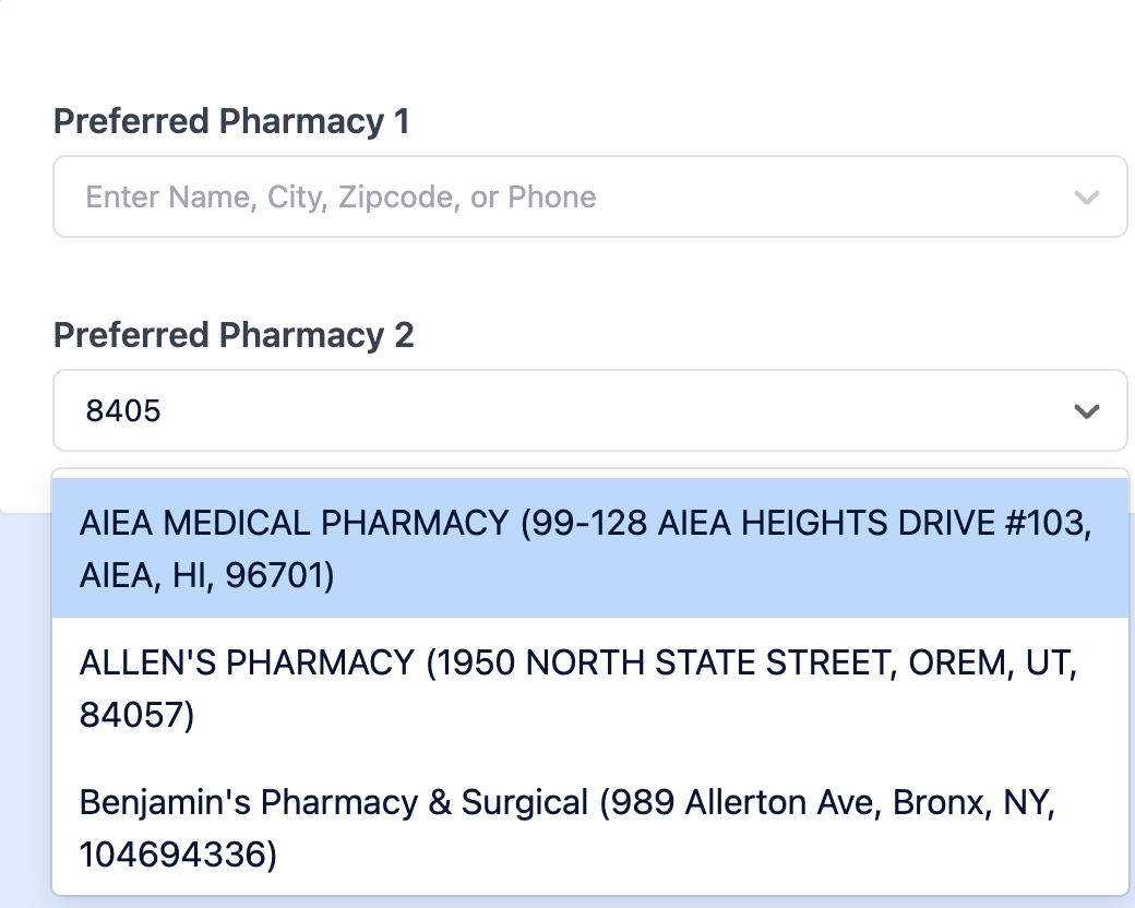 After mapping, the field will automatically display a searchable list of pharmacies for the patient to choose from.