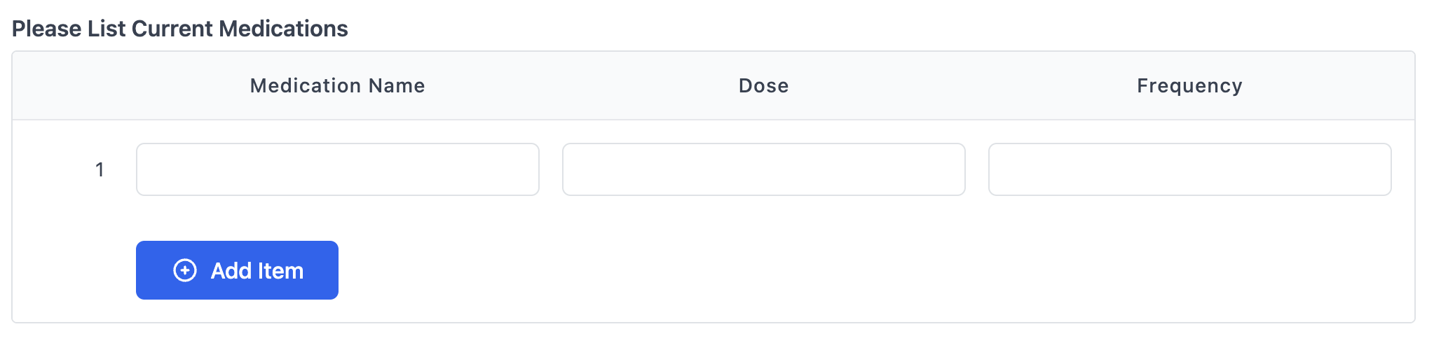 Repeating sections are groups of fields that may need to be duplicated. You only set up the fields once, and all your patient's will see is one section—until they click “Add Item”. Collect as much or as little data as your customers can give, without making them scroll forever just to hit “Submit”.