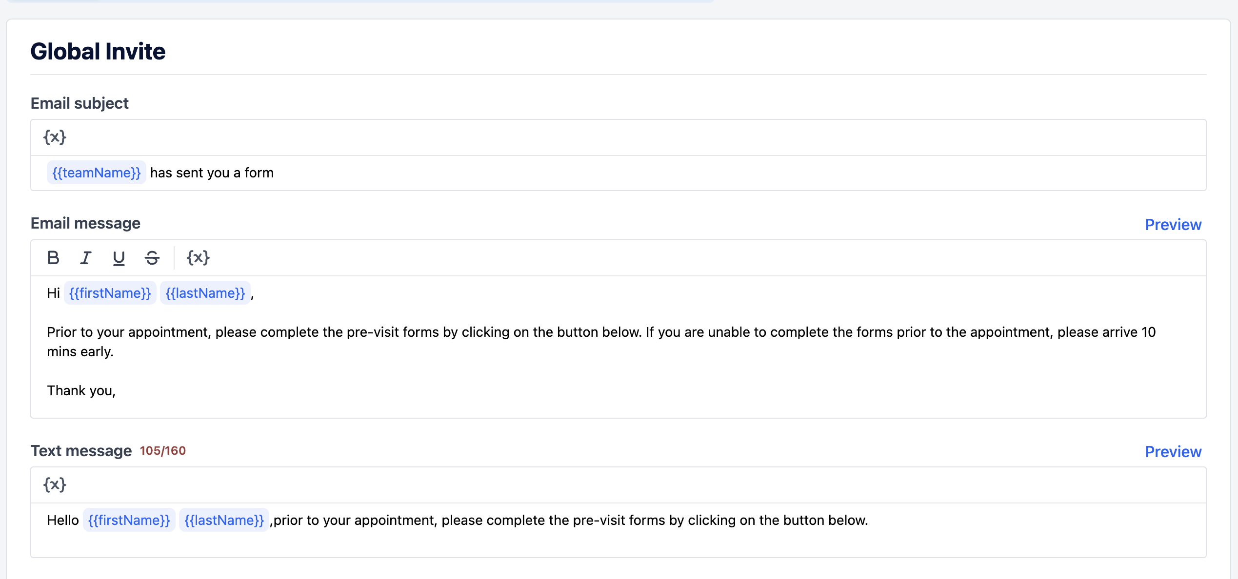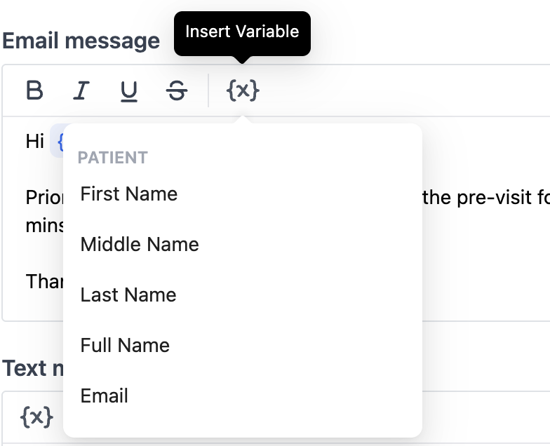 Variables allow you to automatically insert patient details into your email and SMS invites/messages sent to patients.